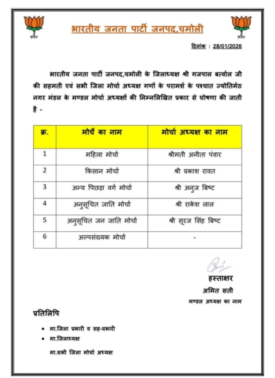 बीजेपी ने ज्योतिर्मठ नगर मंडल के मोर्चों की कमान सौंपी