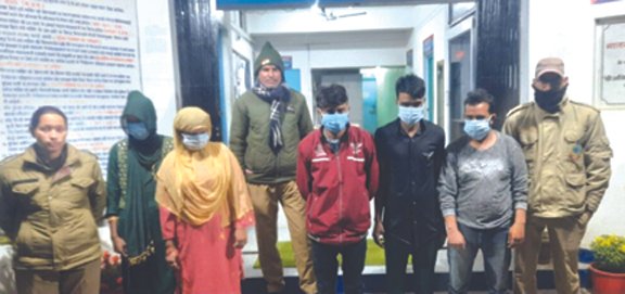 हरिद्वार। रानीपुर कोतवाली क्षेत्र के सलेमपुर चौक के पास एक कार में अश्लील हरकतें करते हुए पुलिस ने दो महिलाओं व तीन युवकों को गिरफ्तार किया है। पुलिस ने सभी के खिलाफ मुकद्मा दर्ज कर उनका चालान कर दिया है। जानकारी के मुताबिक रानीपुर क्षेत्र के सलमेपुर चौक पर एक कार यूके 17 ए 1542 में सवार दो महिलाएं व तीन पुरुष अश्लील हरकतें कर रहे थे। इसी दौरान पुलिस ने पांचों को गिरफ्तार कर लिया। थाने लाकर पूछताछ करने पर आरोपितों ने अपने नाम मुस्तफा उम्र 28 वर्ष पुत्र मुसर्रत निवासी ग्राम दादूपुर गोविंदपुर कोतवाली रानीपुर हरिद्वार, जब्बार अली उम्र 20 वर्ष पुत्र अब्दुल कलीम कस्बा व थाना तुबनगंज जिला कुच्छ बंगाल हाल पता सलेमपुर थाना रानीपुर हरिद्वार, असगर अली उम्र 23 वर्ष पुत्र मुजम्मिल शैख निवासी ग्राम दिवोपार थाना तुबनगंज बंगाल हाल पता सलेमपुर थाना रानीपुर हरिद्वार, एक महिला उम्र 30वर्ष मोहल्ला अहबाबनगर थाना ज्वालापुर व उम्र 22 वर्ष की एक अन्य महिला ग्राम जाटीयान थाना कोतवाली जिला बिजनौर उत्तर प्रदेश हाल पता झंडा चौक थाना कनखल जनपद हरिद्वार बताया। पुलिस ने कार को सीज कर सभी का चालान कर दिया है।
