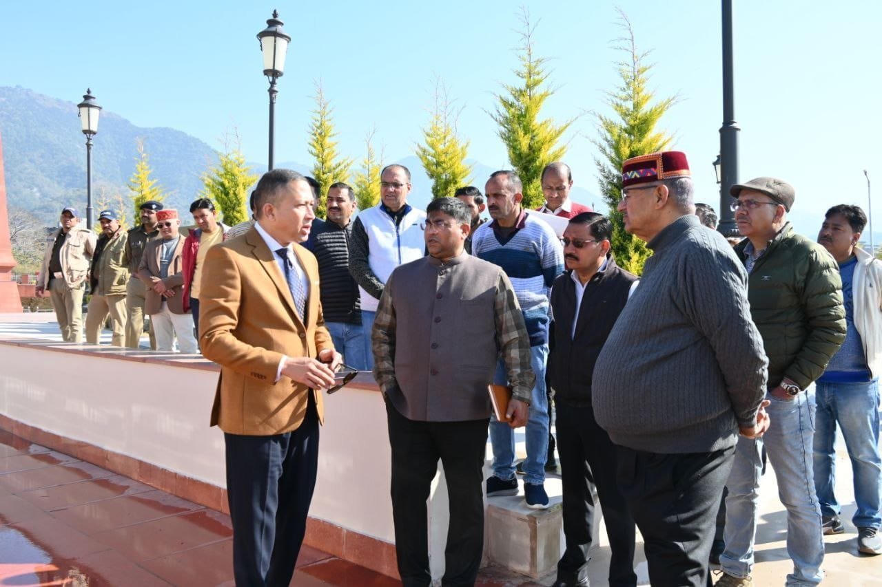 निर्माणाधीन सैन्यधाम के अंतिम चरणों के निर्माण कार्यों का निरीक्षण करते सैनिक कल्याण मंत्री गणेश जोशी
