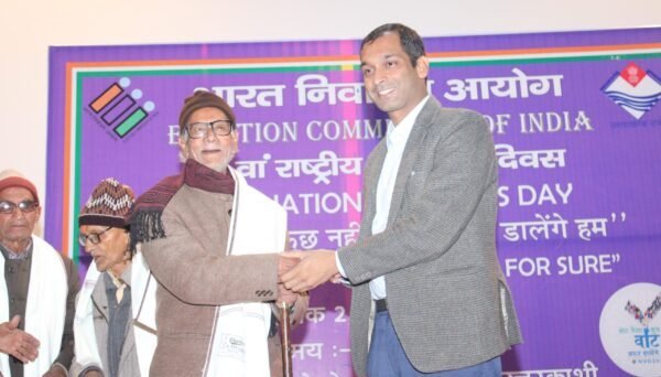 राष्ट्रीय मतदाता दिवस के अवसर पर कलक्ट्रेट ऑडीटोरियम में आयोजित मुख्य कार्यक्रम में शपथ ग्रहण के बाद जिलाधिकारी एवं जिला निर्वाचन अधिकारी अभिषेक रूहेला ने 80 वर्ष से अधिक आयु के वरिष्ठ मतदाता कपूर सिंह, प्रेम दत्त रतूड़ी, तेजेन्द्र सिंह बिष्ट, हरि सिंह राणा, रुकम सिंह पंवार, शिव सिंह रावत, कर्म चंद रमोला और दिव्यांग मतदाता जगेंद्र सिंह, रामपाल सिंह, शुभम, विजय लाल को शॉल भेंट कर सम्मानित किया। इस अवसर पर युवा व नए मतदाता नीलम भद्री, आरती परमार, उन्नति, मुस्कान, राधिका, ममता, रितिक असवाल व गौरव बरमोड़ा को वोटर कार्ड व गिफ्ट भेंट कर सम्मानित किया गया।